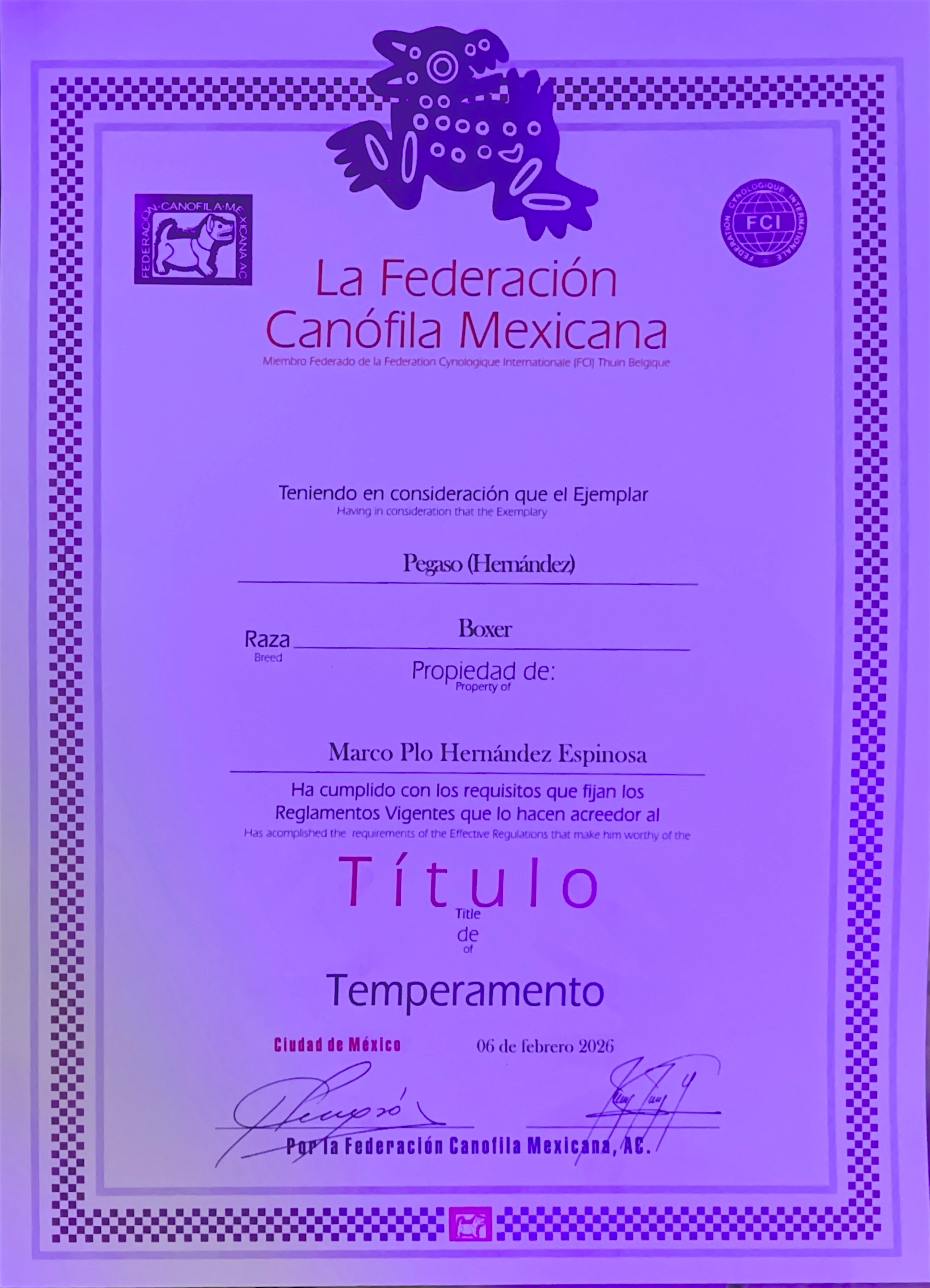Pegaso es la joya de nuestro criadero, un macho de presencia imponente y calidad excepcional. Su legado genético es incomparable y su temperamento ejemplar.